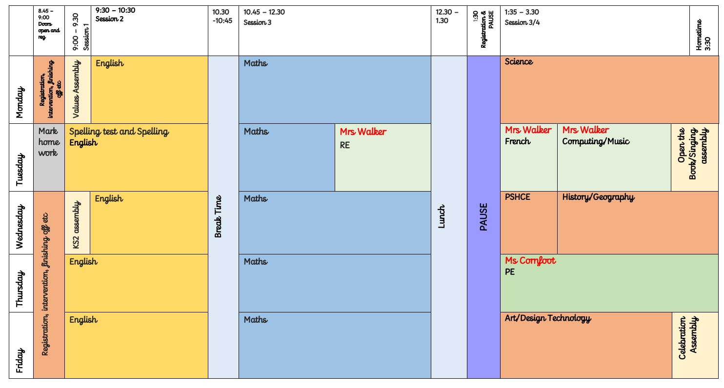 Doors open at 8:45 am. Children will begin work straight away - this can include revision, finishing off work or reading.