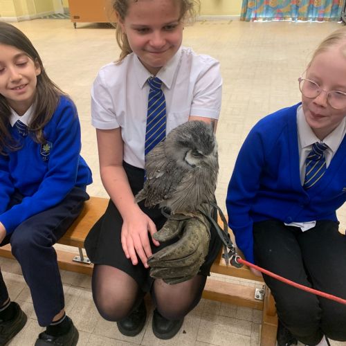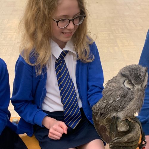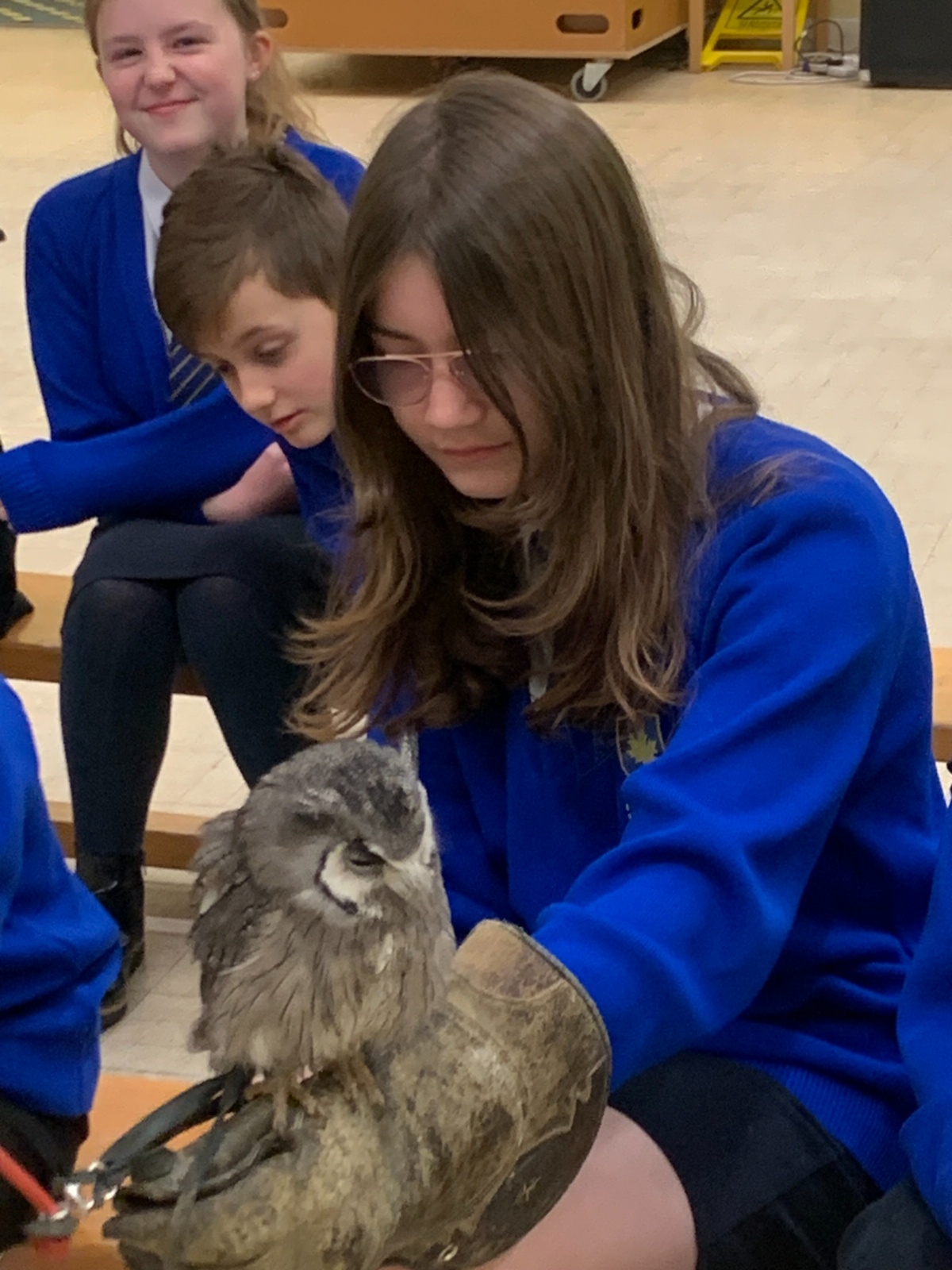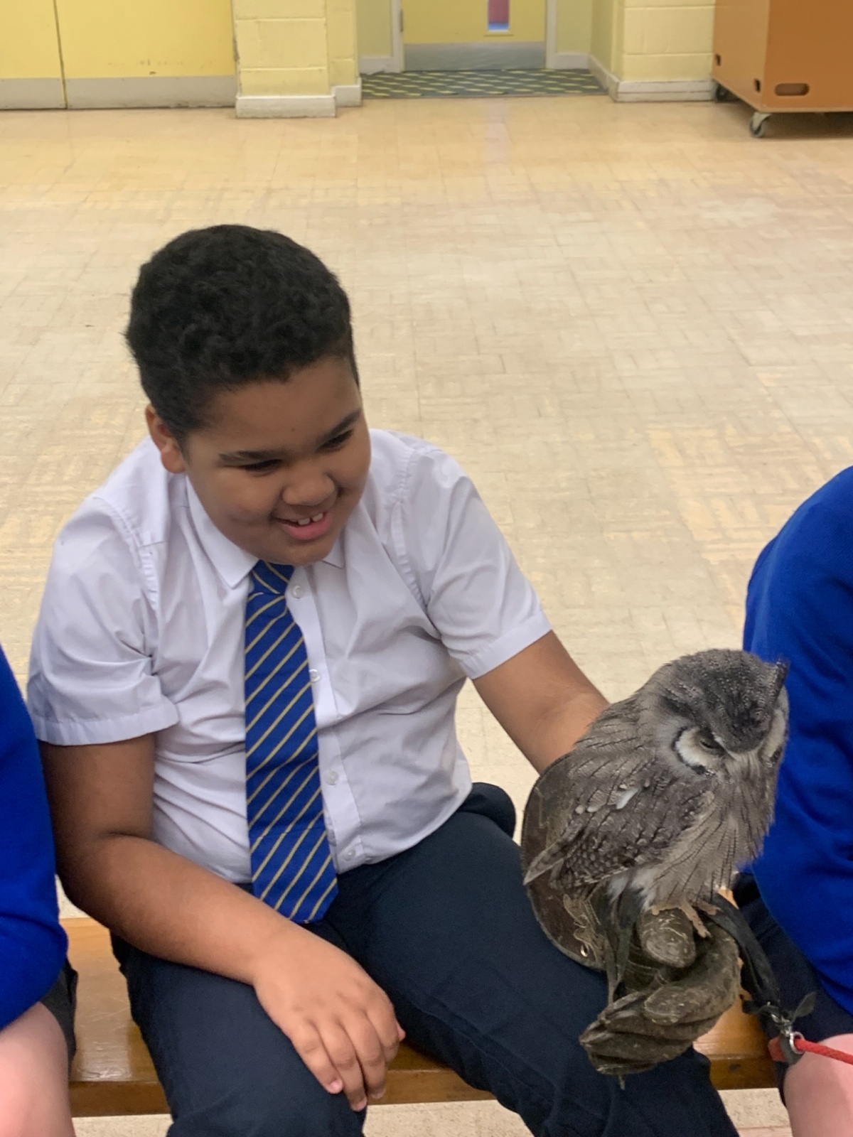 Year 6 had a surprise visit from Herrings Green Bird of Prey Centre today to bring our writing unit on Skellig to a close. We were able to hold a kestrel and a southern-white faced owl. We saw a Harris hawk and a Cape eagle-owl flying. We learnt some amazing facts about owls and birds of prey.