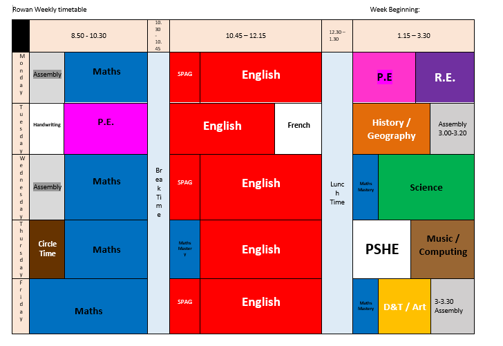 P. E: Rowan have P. E on Monday and Tuesday. Please ensure your child has a full, named P. E kit. Long hair needs to be tied up and jewellery is removed, or earrings covered.